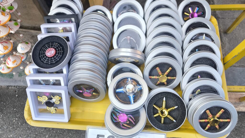 ホイアンの旧市街を歩いていると、道端に屋台も含めてお土産屋がずらっと並んでます。ランタン、洋服(仕立て屋もあり)、雑貨、おもちゃ、お土産……大人からすると「かわいいな〜」で終わるんだけど、男児の目にはどうやら別世界に見えるらしい。その中で息子の視線を一瞬でロックオンしたのが、あの懐かしのおもちゃ、ハンドスピナー