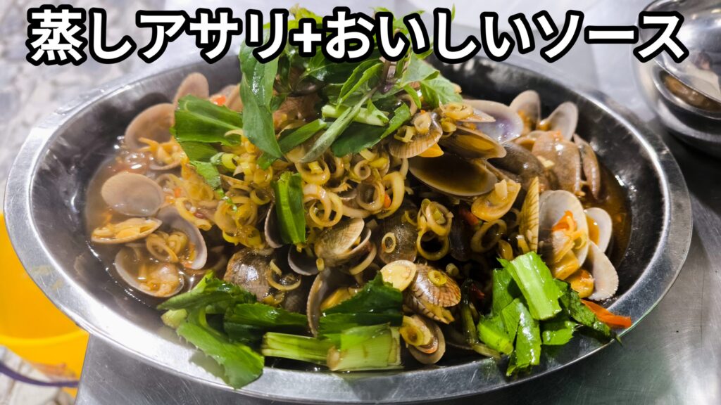 場所はビーチからも近く、観光客でもアクセスしやすいエリア。それなのに、観光地ど真ん中の割高感は一切なし。まず店の前を通った瞬間にわかるんだけど、とにかく混んでる。近隣の海鮮居酒屋と比べても、席の埋まり方が明らかに違う。これはもう、地元民に支持されてるやつだな…と即察知。実際私たちしか外国人がいない。