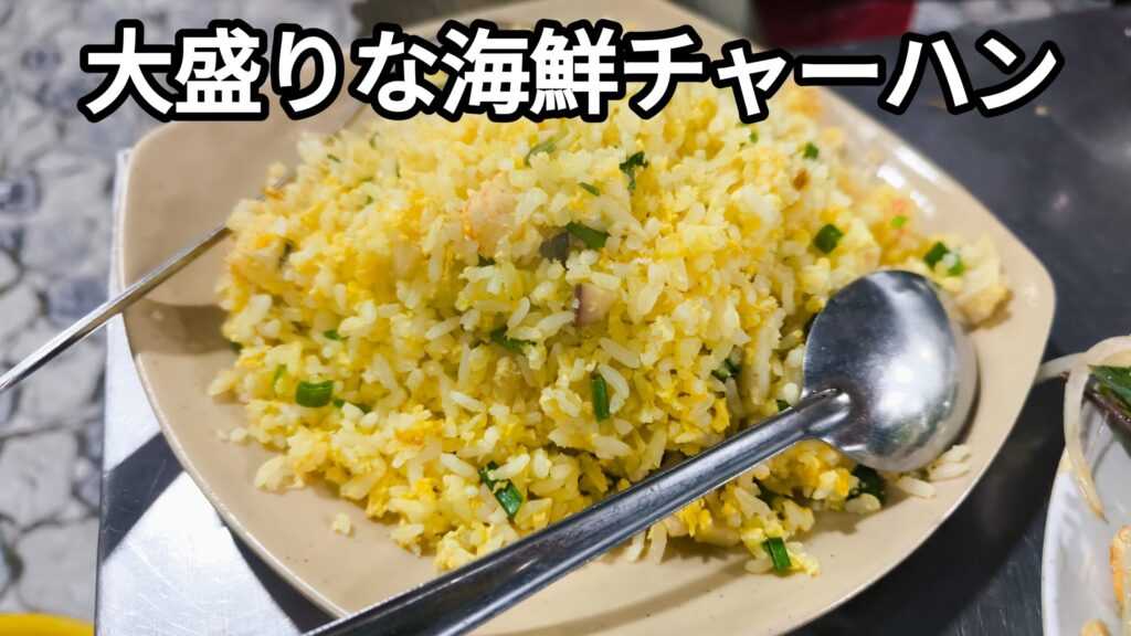 まず海鮮チャーハン。ありがちな脇役ポジションかと思いきや、米がパラッッパラで旨味が強く、「え、これ主役張れるやつじゃん?」ってなる。卵がおおい。(卵チャーハンもあります)チャーハン=油で炒めるはずなのに、なぜこんなに油ぶんがないのか???お皿にも油がのこっていない。なんで??
