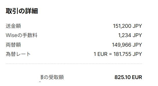 ちなみに、12月に送金したときと比べると、為替レートはけっこう違っています。今回の取引では、1ユーロ=181.755円。一方、12月の送金時は183円台だったので、数字だけ見るとわずかな差に見えても、実際には受取額にちゃんと影響が出ます。こうやって同じWiseの画面で過去の取引を見比べると、「あ、円安進んでるな……」が数字で実感できるのが、正直ちょっと切ないところw