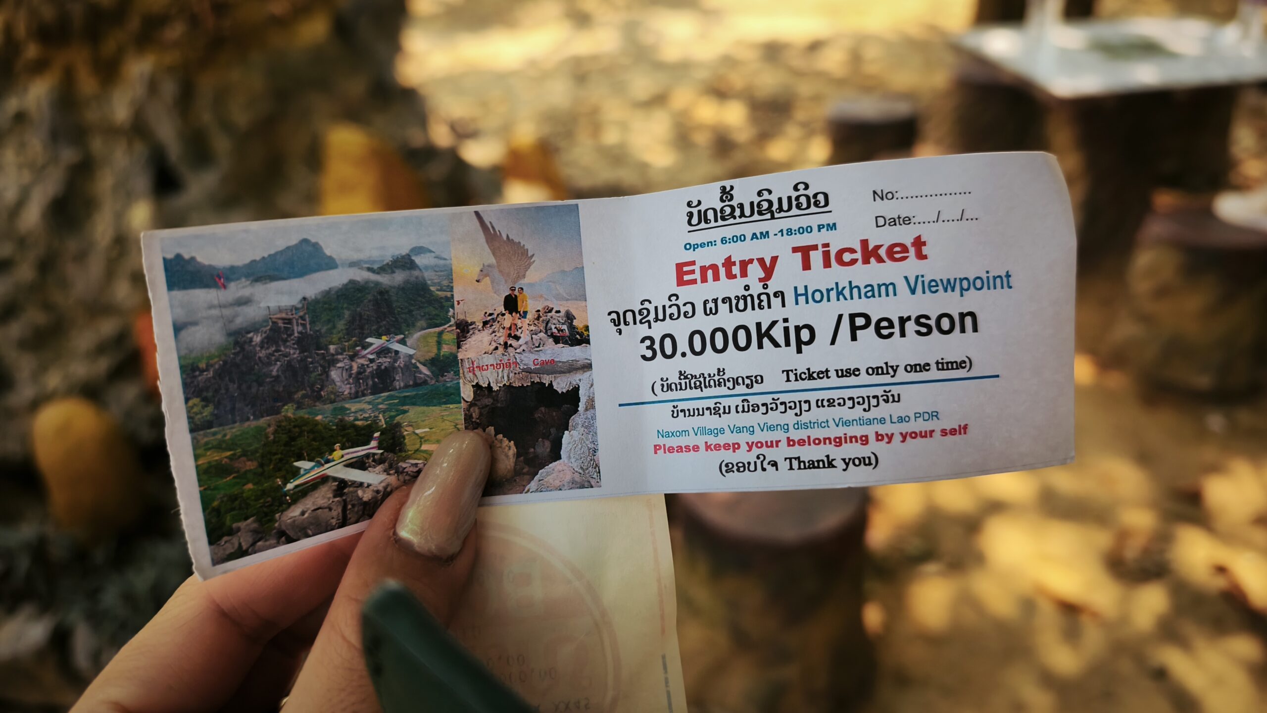 まず向かったのはビューポイント。Pha Honekham View Pointの入山料は大人1人30,000キープ(約220円)。軽い気持ちで登ると普通にしんどい系の登山ですが、上からの景色はかなり良い。バンビエン特有のカルスト地形が一望できて、達成感も含めて満足度は高め。小3ぐらいなら登れるけどそれ以下はかなり厳しいかも。。軍手を持参するとよいです。靴は必ずスニーカーで。