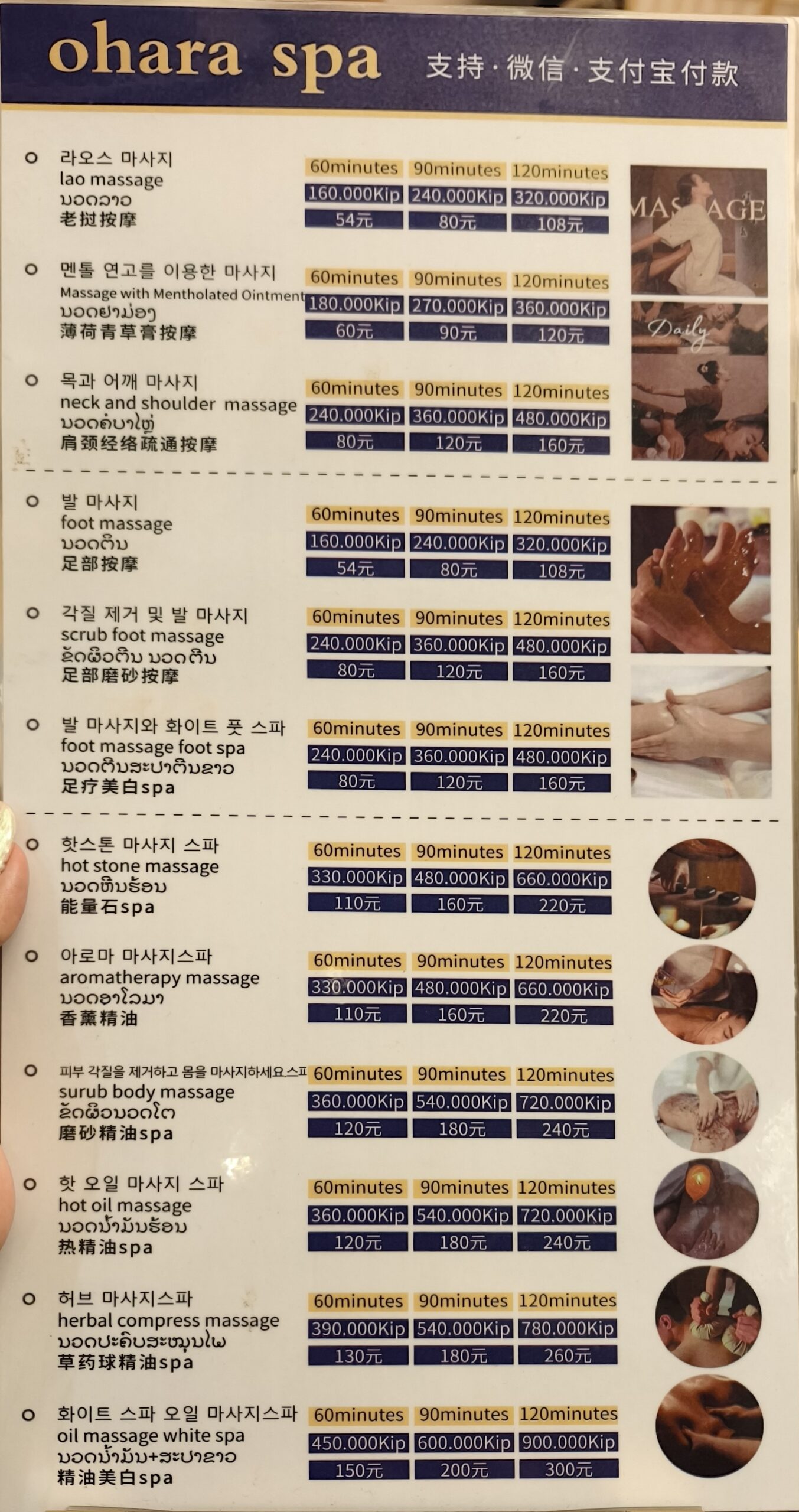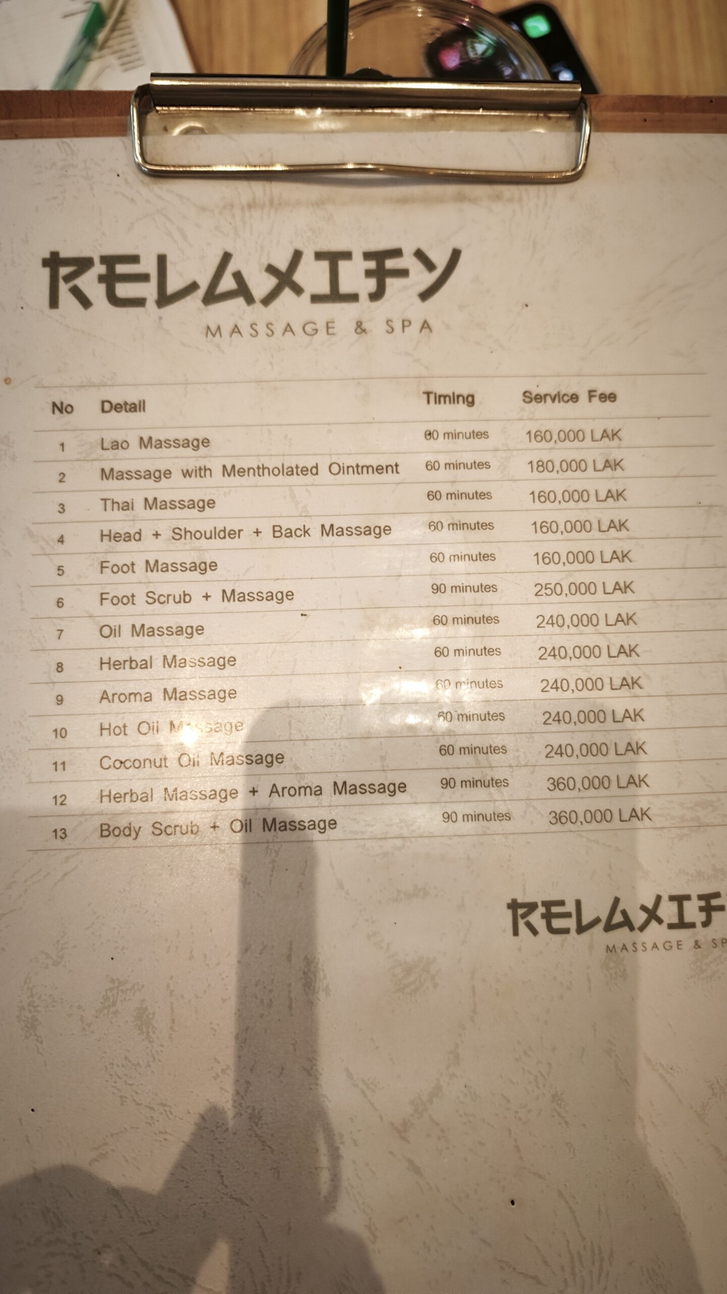 高級ラインになると、スパ系やスクラブ付きで360,000〜720,000キープ(約2,700〜5,400円)まで一気に上がります。特に120分コースになると価格差がはっきり出て、「ローカル店でもちゃんと高級帯が存在する」ことが分かります。