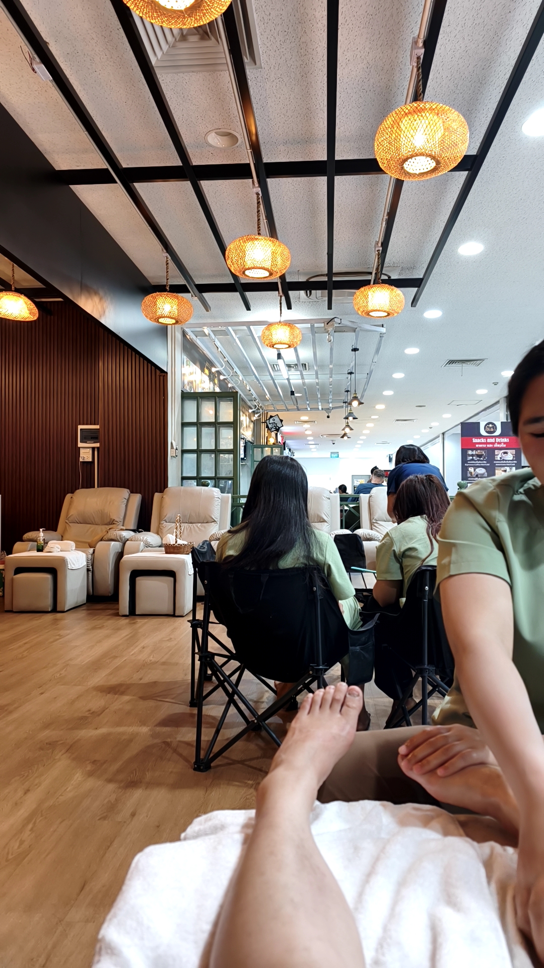 実際の店内はかなり清潔感があって、照明も明るすぎず暗すぎずちょうどいい〜。写真でもわかる通り、リクライニングチェアがずら〜〜っと並んでいて席数も多め。スタッフのお姉様たちも複数人いて、待たされる感じはほぼなさそうな回転の良さでした。内装も木目と暖色ライトで統一されていて、いわゆる“安いローカルマッサージ感”ではなく、ちゃんと整えられた空間でした〜。ふかふかのソファがきもちー!